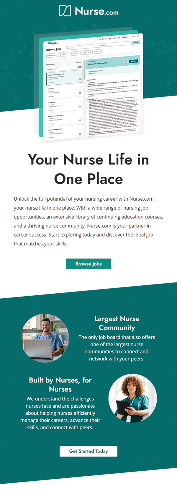 Designed targeted emails introducing Nurse.com’s new product, balancing compelling visuals and clear messaging to drive awareness and subscriber engagement.